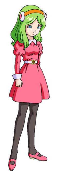 Su apariencia como civil es la de una joven mujer de rostro agraciado y pálido con ojos semi curvos de color celeste pálido y largas pestañas. Posee una contextura delgada, alta, piel blanca y cabello de color lima y sombras verdes. Utiliza un par de auriculares o cascos de color blanco y una vincha naranja. Su vestido es de color rosa, que también posee minifalda y cinturón. Usa pantimedias de color negro que terminan en sus zapatillas rosas.