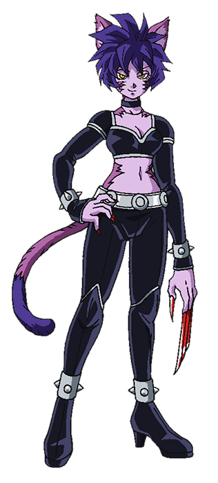 Tiene la apariencia de una felina humanoide con colores predominantemente morados y negros en su cuerpo. Viste un atuendo oscuro y blanco con brazaletes de púas en ambas muñecas y en los tobillos. También posee unas largas uñas rojas, las cuales emplea como letales armas.