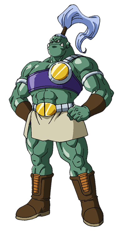 Es un hombre musculoso y bastante alto de piel verde oscuro con unos colmillos que sobresalen de su boca. Usa una ropa de gladiador constituida por una pechera azul con una esfera amarilla, una falda de gladiador, botas y brazaletes marrones. Lleva ornamentos plateados en los brazos y tiene el cabello blanco y largo, agarrado en una coleta hacia arriba.
