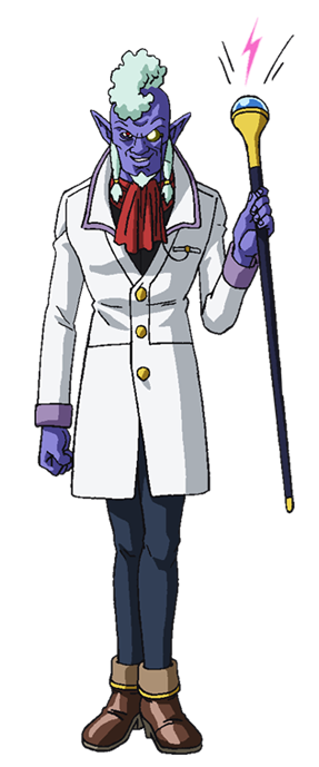Es un individuo humanoide de piel lavanda. Su cabello es blanco y crespo, también posee barba y dos coletillas. Usa una túnica blanca con bordes violetas, un monóculo amarillo y siempre porta un bastón.